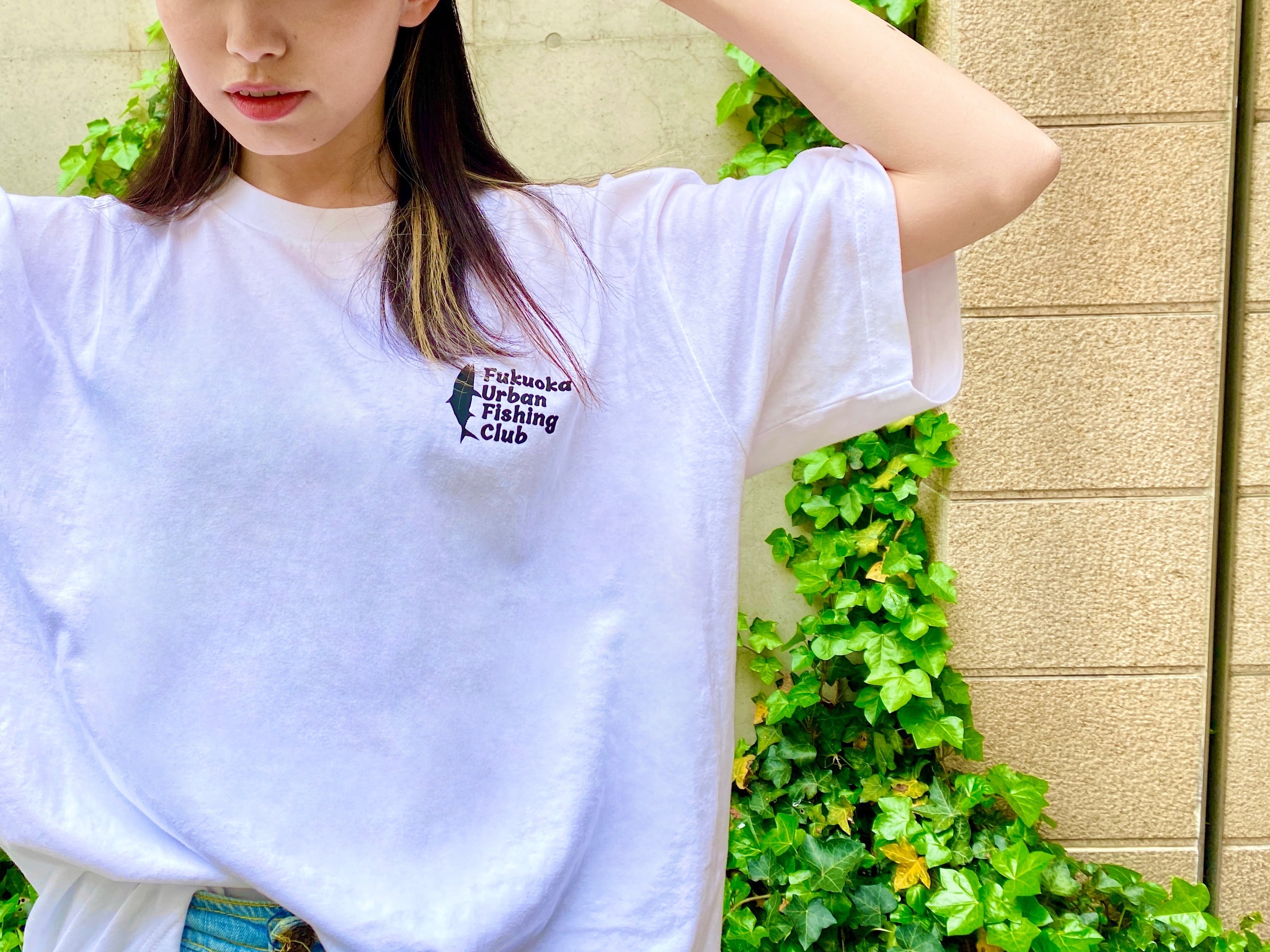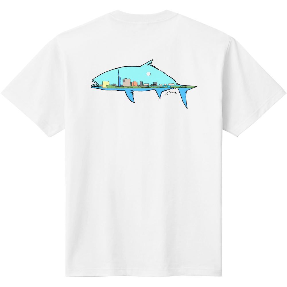バックプリントは博多湾から臨める福岡の街並みとヒラマサをマッチングさせたデザイン